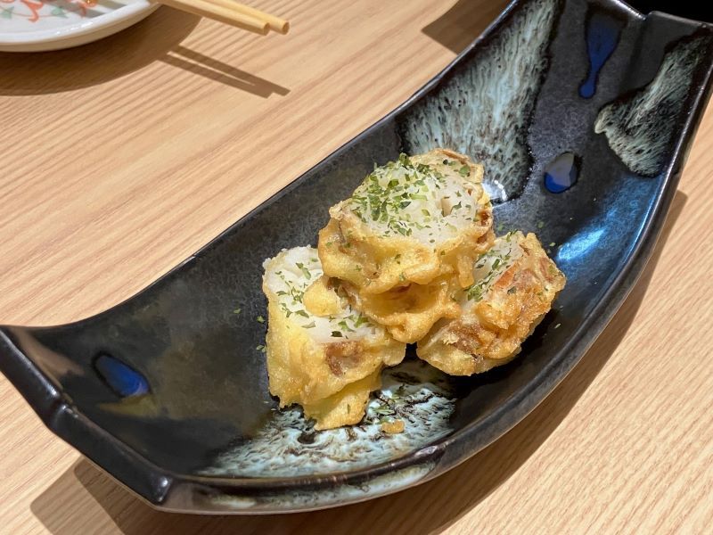 遊び仲間の集まりで、大阪市・梅田の商業ビル「KTTTE]の中の九州酒場「つくし」に行った。九州の焼酎や日本酒を揃えた店だった。 その日の突き出しは、キュウリとサツマイモだった。料理で印象に残ったのは竹輪サラダ。仲間によると、九州名物だという。竹輪の穴にマッシュポテトを詰め、衣をつけて揚げてあった。ほかに、つくしのカルパッチョ(その日はカンパチ)、明太子だし巻きなどを食べた。(梶川伸)2025.09.24