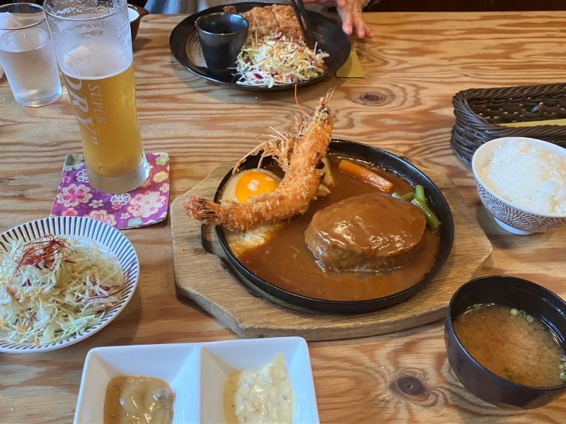 食べたのは、海老フライ&ハンバーグで、2550円。大きな海老フライで、バジルと奈良漬けの2種類のタルタルソースで食べる。ハンバーグは分厚く、スパイスは抑えめで肉の味を大事にしているように見える。タップリのドミグラスソースが周りにかけている。目玉焼き、ゆでた野菜がプレートに乗っている。みそ汁とご飯がついている。