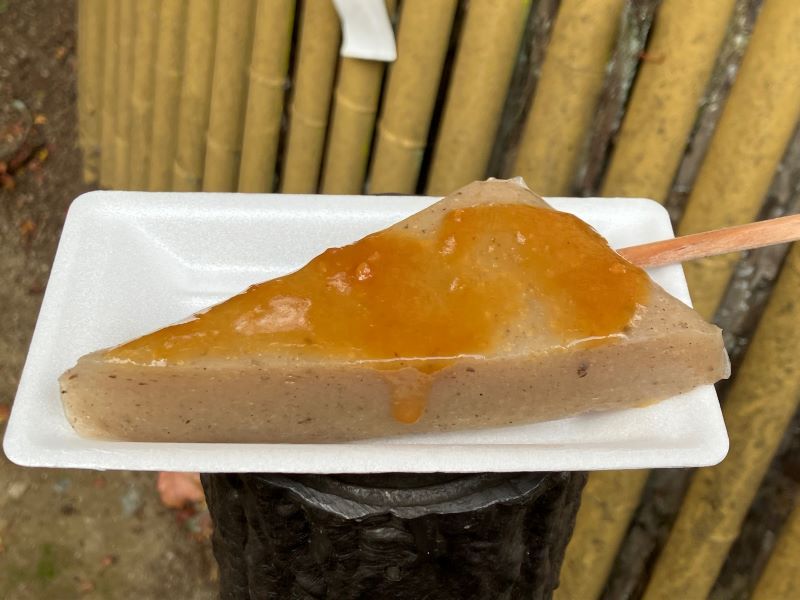奈良県桜井市、談山神社に紅葉を見に行った帰り、神社前の店で串こんにゃくを買って食べた。いくつもの土産物屋さんで売っていたが、買ったのは灯篭亭だった。 大きな平たいこんやくを三角に切り、串をさし、味をつけて煮込んでいる。歯応えがあり、味も十分につけてあるが、さらにみそをつけて食べる.。みそは合わせみそなどいくつかあったが、ユズみそを選んだ。(梶川伸)2025.12.04