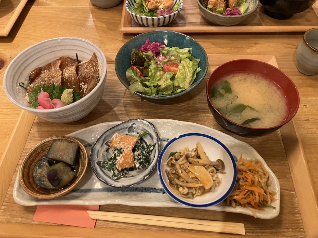 遊び仲間で奈良市・奈良公園に行き、近鉄・奈良駅舎近くの「オモテナシ食堂」で昼ご飯を食べた。私ともう1人が選んだのは鯛めし御膳。しっかりと漬けにした鯛の丼がメーン。ワサビ、ゴマ、刻みノリ、ショウガも乗っていて、バランスと相性がいい。野菜サラダ、野菜中心の小鉢4つ、みそ汁がセットになっていた。
