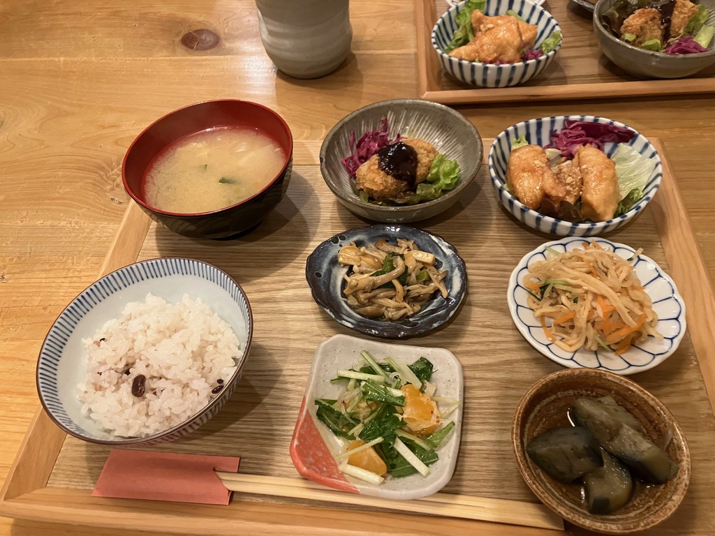メンバーの2人は「からだ想いランチ」。カキやサーモンも使っているが、メーンは野菜で6つの小鉢と雑穀を加えたご飯、みそ汁の組み合わせだった。(梶川伸)2025.12.22