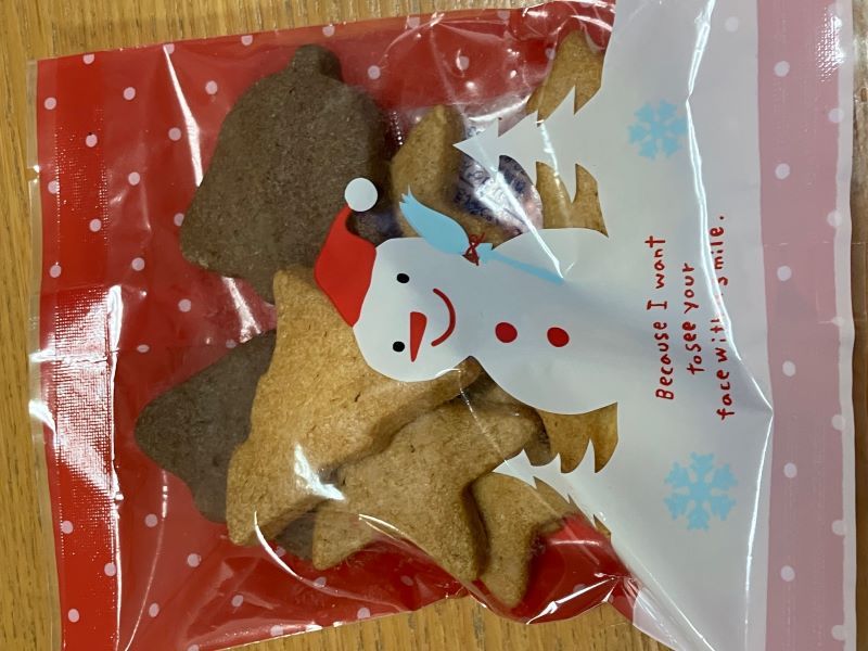遊び仲間が集まった時。兵庫県明石市の友人が、地元の中市大福堂のクリスマスクッキーをみんなに持ってきた。 クリスマスツリーやベル、星、ヒイラギといったクリスマスにちんんだ小型のクッキーがセットになっていた。シンプルだが、卵、乳成分が程よい味になっていた。(梶川伸)2025.12.