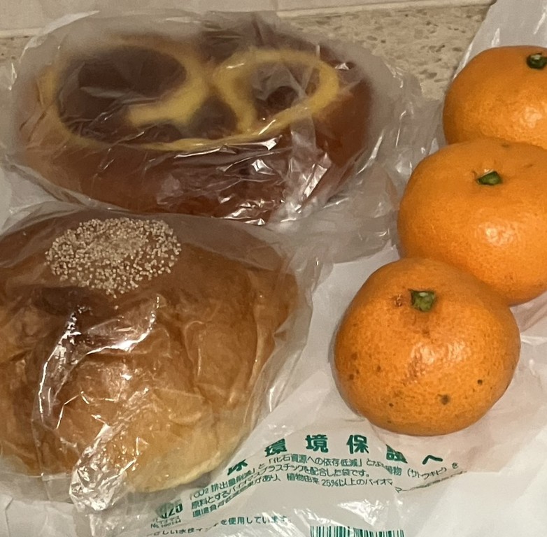 街のパン屋さん。記念日はいつも、未明から店を開いている。あんパンはこしあんと粒あんがあり、買ったのは粒あん。あんがたくさん入っていて、上にケシの実がつけてあった。クリームパンは昔ながらのクルクル模様がクリームで描いてあった。店の女性が「小さいけど」と言いながら、ミカン3つをおまけにつけてくれた。(梶川伸)2026.01.19