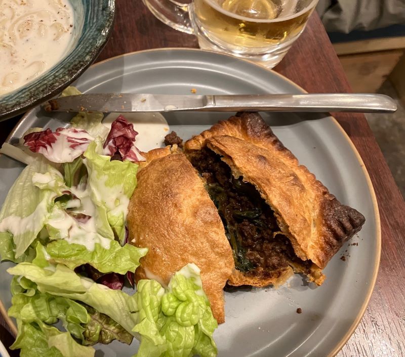 神戸市・三宮の大衆酒場フレンチマンで1杯飲んだ。気に入った食べ物は、レンコンとジェノベーゼのピザ。上にカイワレがたくさん乗っていて、和風の味わいだった。 和牛のパイ包みは数量限定だった。細かい牛肉を和風に味をつけいるが、ハーブも感じる。それをパイ生地で包んで焼いている。ホールチーズのクリームパスタはチーズの濃厚な味が気に入った。(梶川伸)2026.02.04
