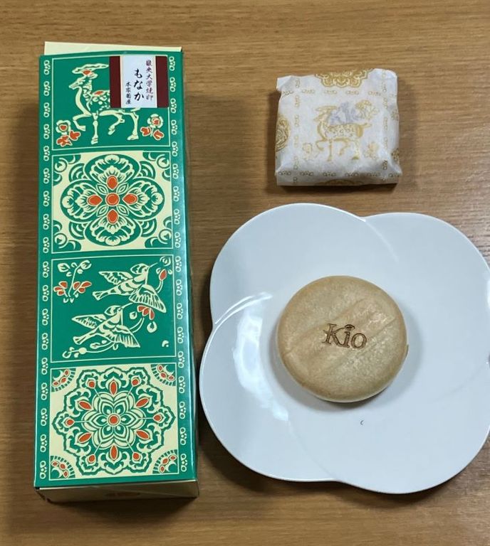 奈良県広陵町、畿央大学に仕事に行ったご近所さんに、土産として畿央大学焼印もなかをもらった。製造は奈良県大和郡山市、菊屋だった。 こしあんの最中。あんはたっぷり入っていて甘め。皮は薄く、真ん中「Kio」の焼き印が押してあった。(梶川伸)2026.03.09