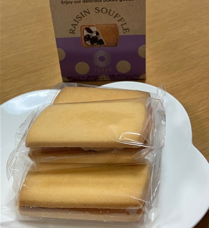 洋菓子「レザンスフレ」の小さなセットをもらって食べた。東京都東村山市、ホワイエの商品。 ラムレーズンと生クリームを、焼き菓子で挟んでいる。それほど強い味ではなく、組合せがいい。(梶川伸)2026.03.23