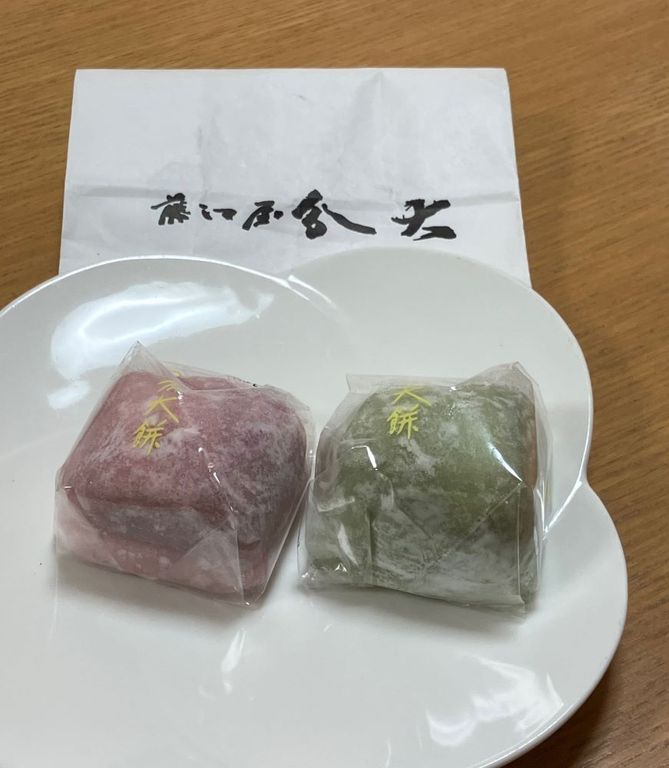 遊び仲間が集まった時、兵庫県明石市のメンバーが、地元の分大餅を持ってきた。藤江屋分大の商品。 緑とピンクの2種類がセットになっていた。こしあんを餅で包んでいる。甘みを抑え気味にしてあり、落ち着いた味だった。(梶川伸)2026.03.27