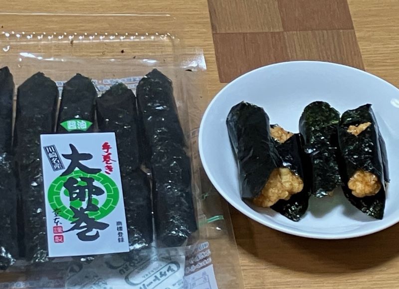 ご近所さんに、大師巻をもらった。神奈川県川崎市、堂本製菓の商品だった。 川崎大師にちなんだネーミング。ハチミツや水あめを使って甘めの味つけをした直方体のおかきを、ノリで巻いている。ノリのパリパリさがいい。包装の袋には、全国推奨観光土産品、かながわの名産100選といったものがいくつも印刷してあった。(梶川伸)2026.04,02