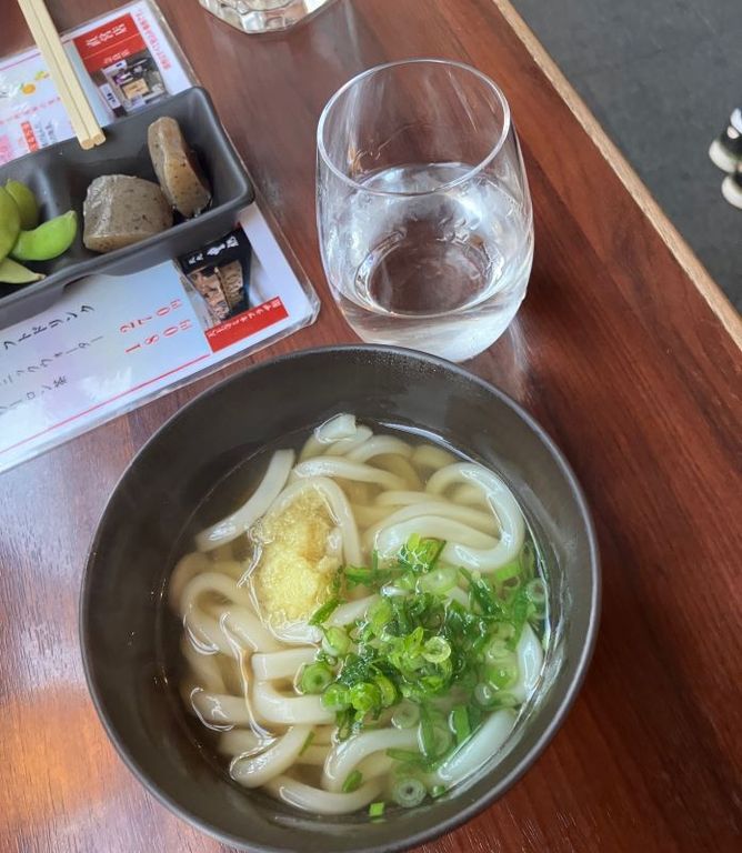 奈良市・近鉄大和西大寺駅のエキ中の立ち飲み屋さん「豊祝」に行き、おでんのメニューの中にうどんがあったので注文してみた。180円。 素うどにおでんのつゆをかけてある。居酒屋メニューとしては変わっていた。(梶川伸)2026.04.13