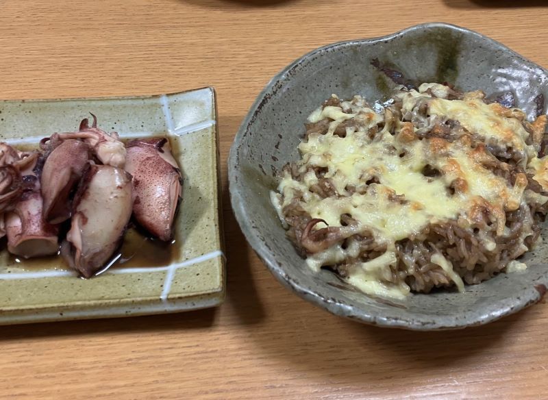 ヒイカを煮たあと、煮汁を少しと小さな足を鍋に残し、ご飯を加えて再度煮る。グラタンなどの容器に移し、とろけるチーズを乗せてオーブンで焼く。ヒイカの皿の横に並べてテーブルに乗せれば、貧弱さは気にならない。