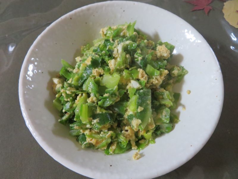 今回は乾煎りを工程に入れてみた。ただ、うちにはほうろくがないにで、フライパンで代用した。キャベツを細切りにして、鶏ガラスープ素、塩、コショーで煮る。水分をほとんど除き、フライパンで乾煎りし、溶き卵でとじでバージンオリーブオイルをかける。