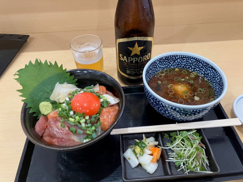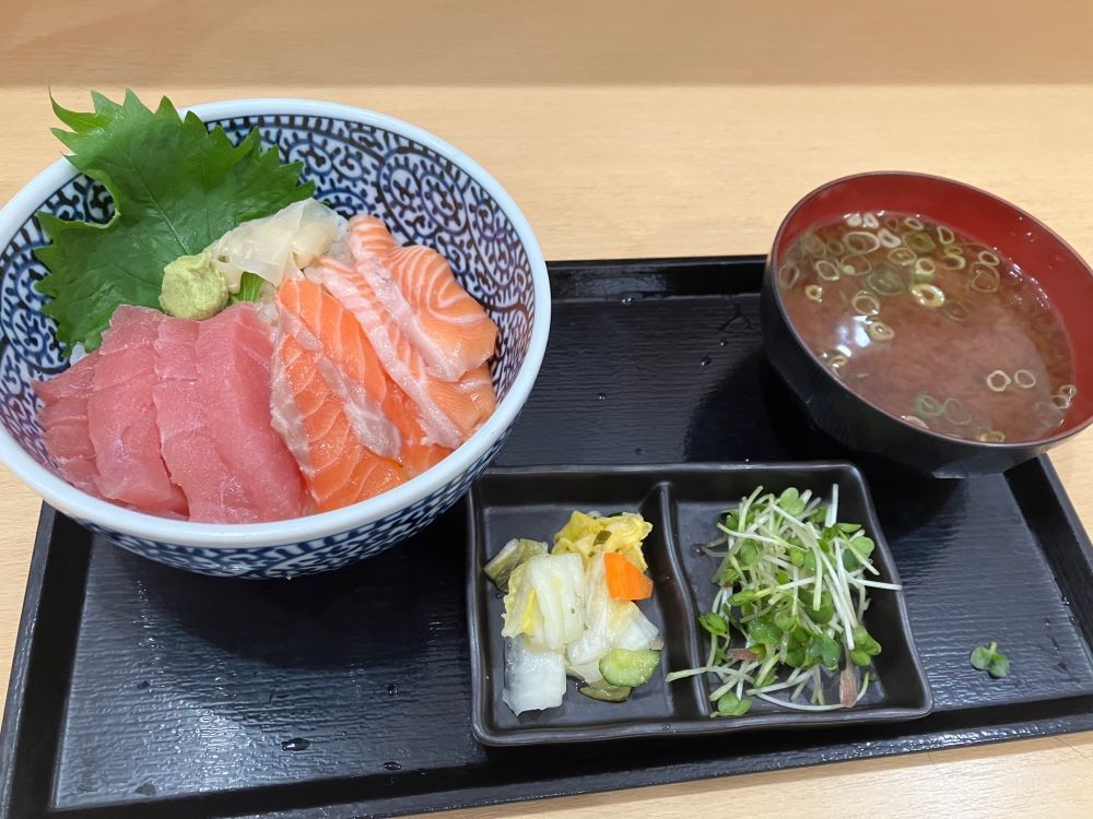 切り落としと思われる魚類、マグロ、イカ、サーモンなど漬けにしてあって、温かい酢飯の上に盛ってある。ワサビ、ショウガ、キザミネギが添えてある。さらにこだわった卵の黄身が乗せてある。こだわり卵を浮かべたみそ汁、漬け物がついていた。友人が食べたのは、マグロとサーモンの丼のセットだった。(梶川伸)2025.09.30