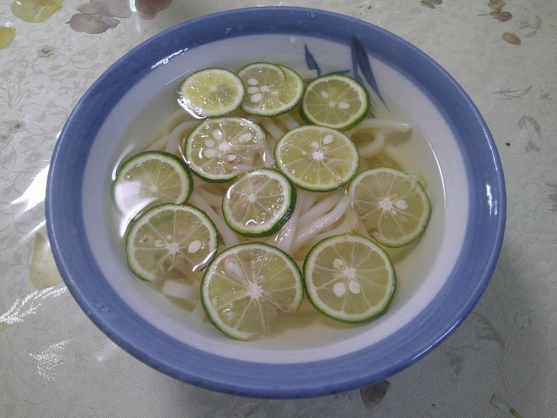 スダチが届いた。冷凍うどんもある。そこで、スダチうどん。ズボラ料理らしい安直な料理。