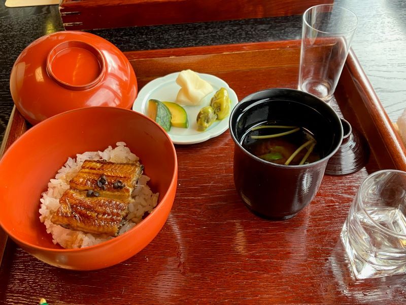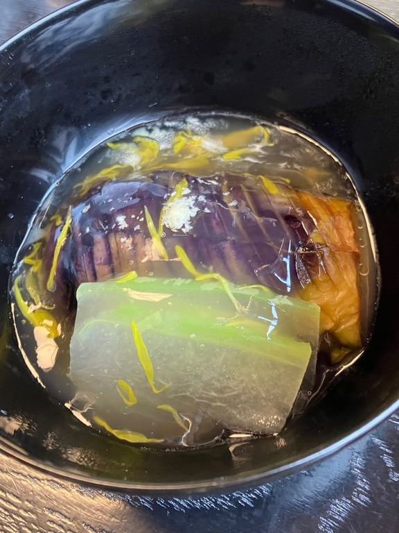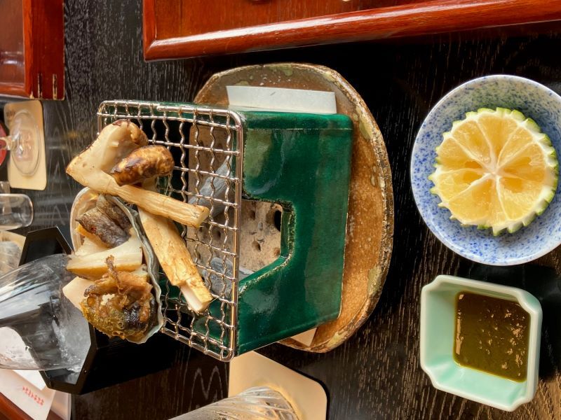 献立を紹介する。▽献酒▽前菜(秋の彩り盛り)▽造里(本日入荷のお造り)▽煮物椀(松茸土瓶蒸し・名残り鱧)▽焼肴(松茸・鮑・肝ソース)▽主菜(松茸と黒毛和牛朴葉焼き)▽油肴(松茸ふらいと鱧変わり揚げ)▽鉢物(「秋茄子旨煮菊花あん)▽御飯(うなぎ蒲焼、香の物、赤出汁)▽水物