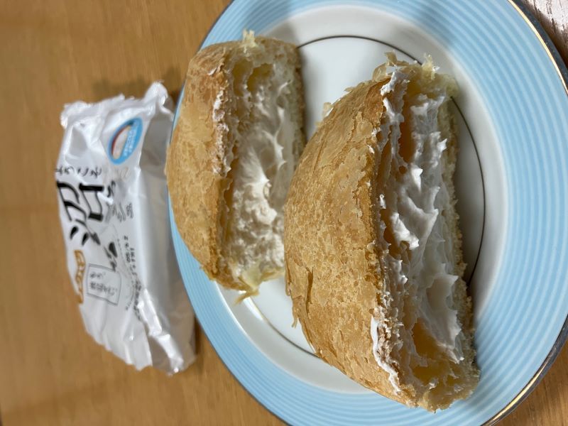 名前からはどんnものかわからない。包装の袋は銀色で、中が見えない。袋を開くと、厚い円盤状だが、パウダーがまぶしてあって、その下がどうなっているのかわからない。切ってみ、初めて実態がわかった。薄めのデニッシュで、生クリームを包んでいる。クリームは量が多いので、甘さは抑えてあった。袋には「もう抜け出せない」と書いてあり、「沼」