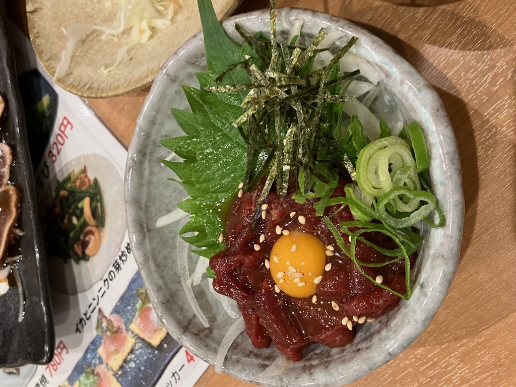 お遍路さんの休憩所作りの活動の集まりのあと、メンバーで大阪市・堺筋本町の居酒屋さん「永吉」で一杯飲んだ。馬肉の料理がいくつかあり、ユッケを食べてみた。 タマネギスライス、大葉、刻みネギ、刻みノリの上に馬肉の刺し身を乗せ、生卵の黄身を置き、甘めのたれがかけてあり、白ゴマもふってあった。(梶川伸)2025.12.15