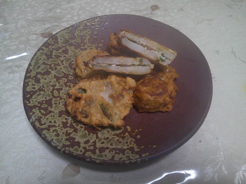 レンコンは皮をピーラーでむく。輪切りにして、軽くゆでる。合いびきミンチとみじん切りのタマネギをボウルに入れ、白だしを少し加えてよく練る。2枚のレンコンの間にミンチをはさみ、レンコンの穴にも詰める。さて、からしはどうするか。記憶では表面が黄色かったから、からしを入れた衣を作り、それをつけて油で揚げた。