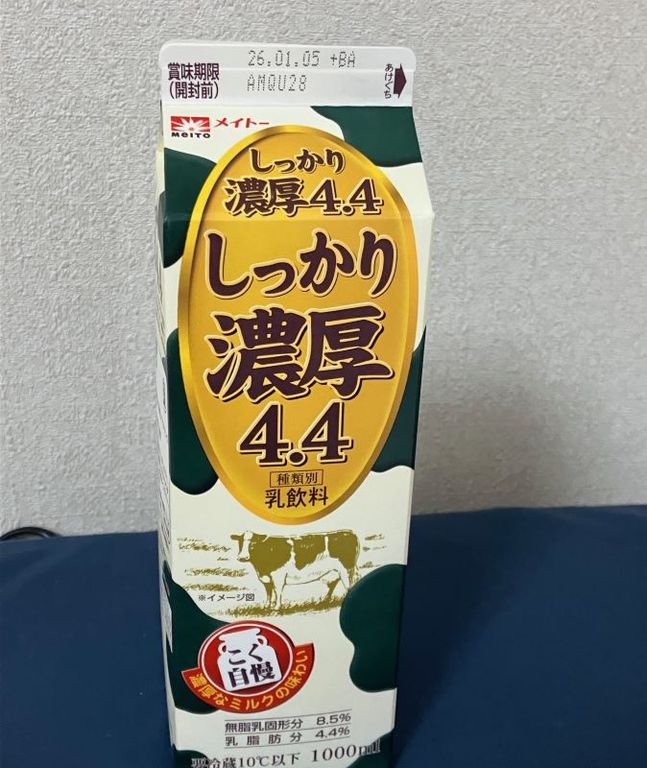 スーパーにある牛乳の飲み比べ、今回は「しっかり濃厚4.4」を買ってみた。東京都中央区、協同乳業の商品。 種別は乳飲料となっている。無脂乳固形分8.5%、乳脂肪分4.4%の表示もある。「こく自慢」の表示もあり、確かにのどの奥にこくを感じる。(梶川伸)2026.01.22