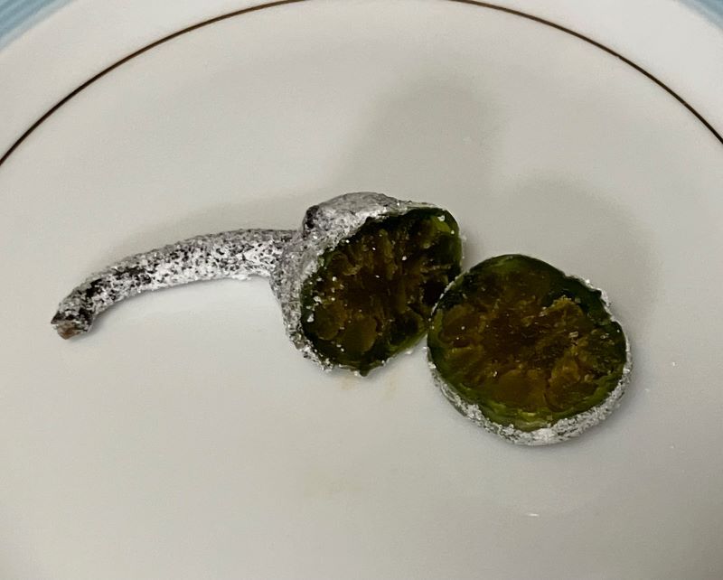 表面は砂糖がまぶしてあり、中はゼリーのような柔らかさがある。つるをつけたままの形がおもしろい。上品なお茶うけといった風情だった。(梶川伸)2026.01.12