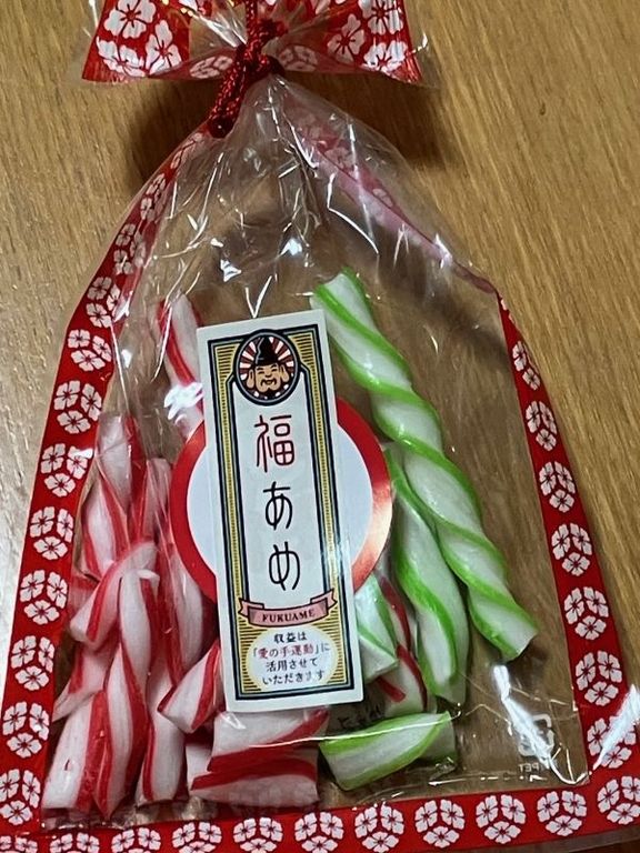 私は元毎日新聞の記者だったこともあり、毎年少しだけ出店をのぞいて販売を手伝い、自らも福あめを買う。いくつかの種類があるが、今年は細いねじり棒になったものを選んだ。東京都台東区、金太郎飴本店の商品だった。500円。袋に2種類のあめが入っていて、赤と白をねじったものはイチゴ味、緑と白は青リンゴのような味がした。(梶川伸)2025.01.14