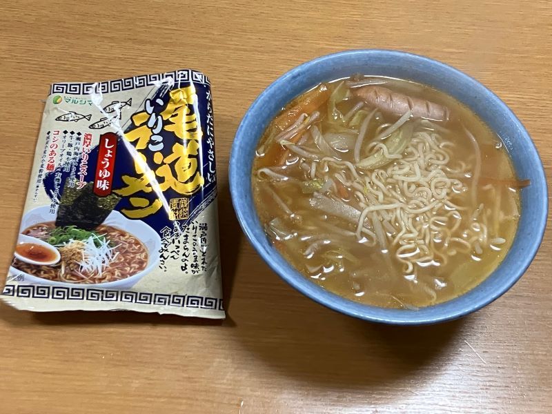 即席麺の食べ比べ、今回は尾道いりこラーメンを選んだ。広島県尾道市、純正食品マルシマの商品。 乾麺1人分が袋に入ったオーソドックスタイプ。麺は淡白な味。スープは小袋に入った液体を伸ばす。瀬戸内海産のイリコを使用している。一方で牛、豚、鶏を使っていない。しょうゆとオリーブオイルで味を整えているが、大変あっさりしている。(梶川伸)2026.02.19