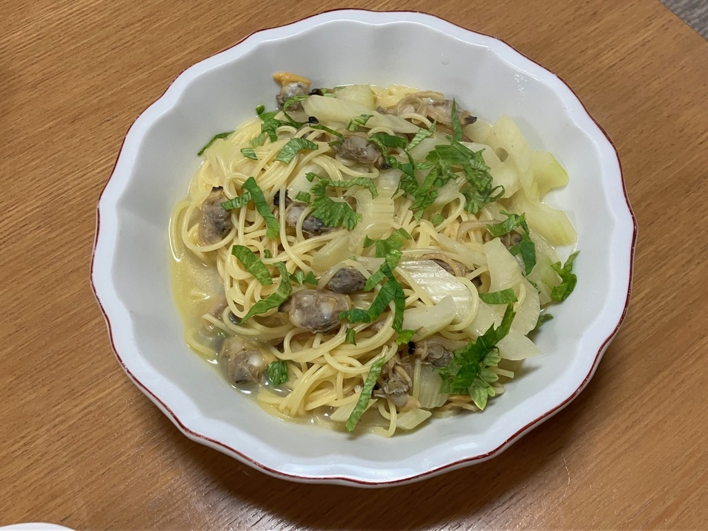 今回は前日に予告メールがあったので、別のパスタにした。アサリは皿に乗せ、白ワインをふって蒸し焼きにする。取り出して、アサリの身を殻から外しボウルに移し、できたスープも入れる。セロリは筋を取り、斜め切りにする。パスタは鶏ガラスープの素を加えてゆでる。フライパンにオリーブオイルをひいて熱し、セロリを炒める。ボウルのアサリとスープ、スパゲッティーとその煮汁も少し入れて熱し、コショウ、白だしも加えて煮る。皿に盛って、セロリの葉の細切りをふる。