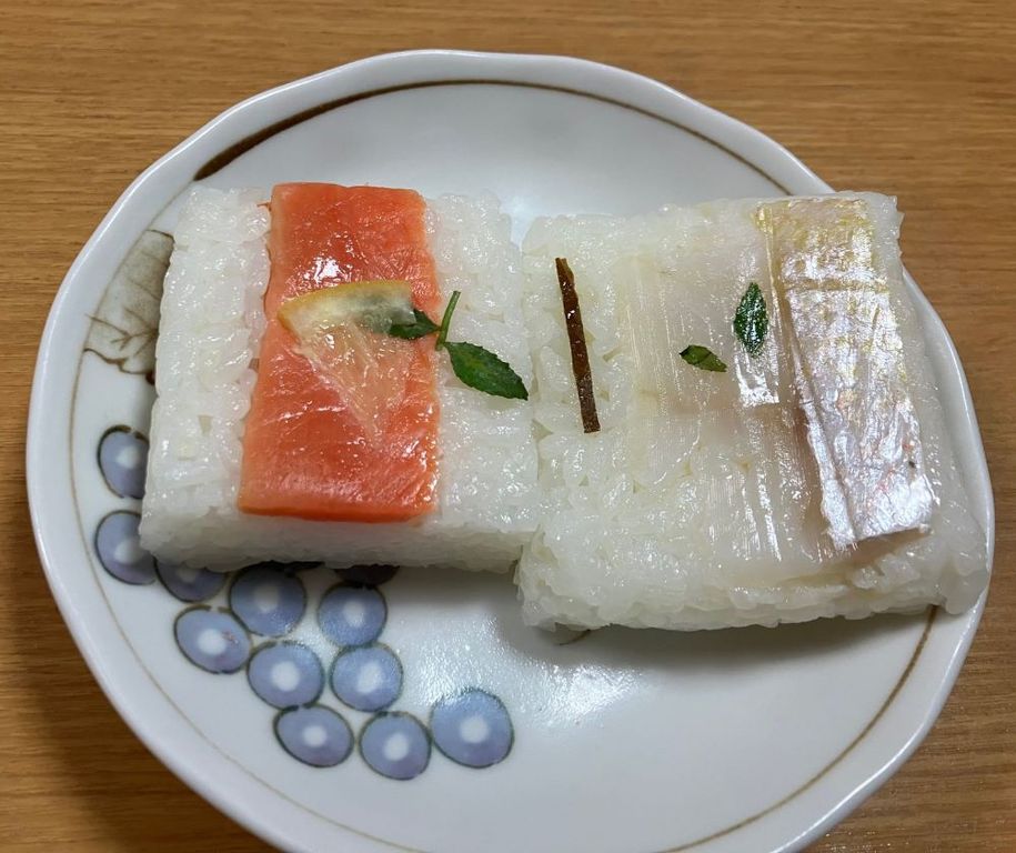 厚みを抑えた正方形の押しずし。ササの葉で丁寧に包んでいる。もらったのは10個入り。サーモン、サバ、タイの3種類が入っていた。小さな木の芽を添え、サーモンにはカットしたレモンを乗せ、サバには白板コンブを張り、タイには細い塩昆布を少し混ぜ、見た目がとても美しい。しっかり押してあり、酢飯の歯ごたえが良く、全体として繊細な味だった。(梶川伸)2026.03.28