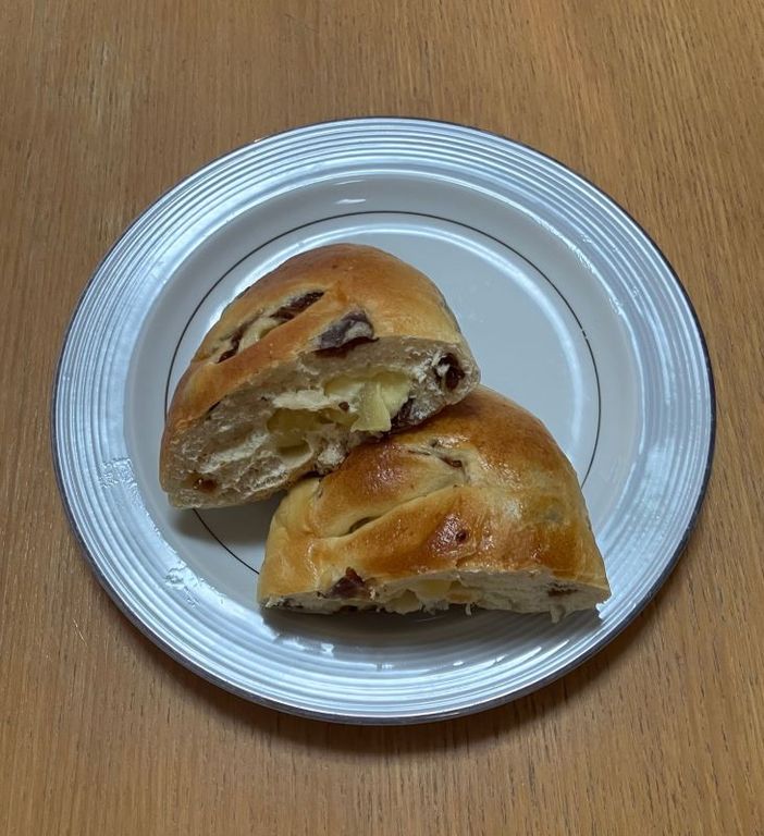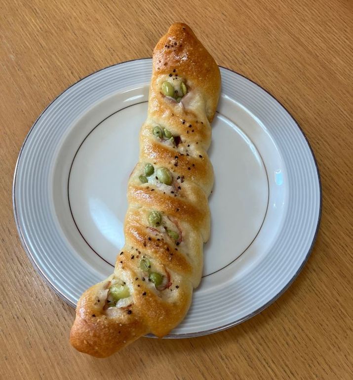 奈良市・近鉄奈良線学園前駅前のエニシスベーカリーでパンを買ってみた。「無添加生地と国産小麦」と看板に書いてあった。 枝豆ベーコンは260円。ネジネジのパンで、枝豆が色を添えている。軽い塩味と黒コショウが良い味つけになっている。アップルベーコンカスタードは240円。紡錘形のパンで、ボリュームがあった、(梶川伸)2026.04.27